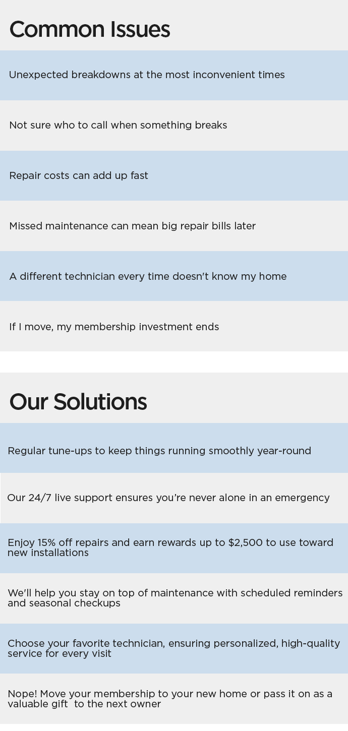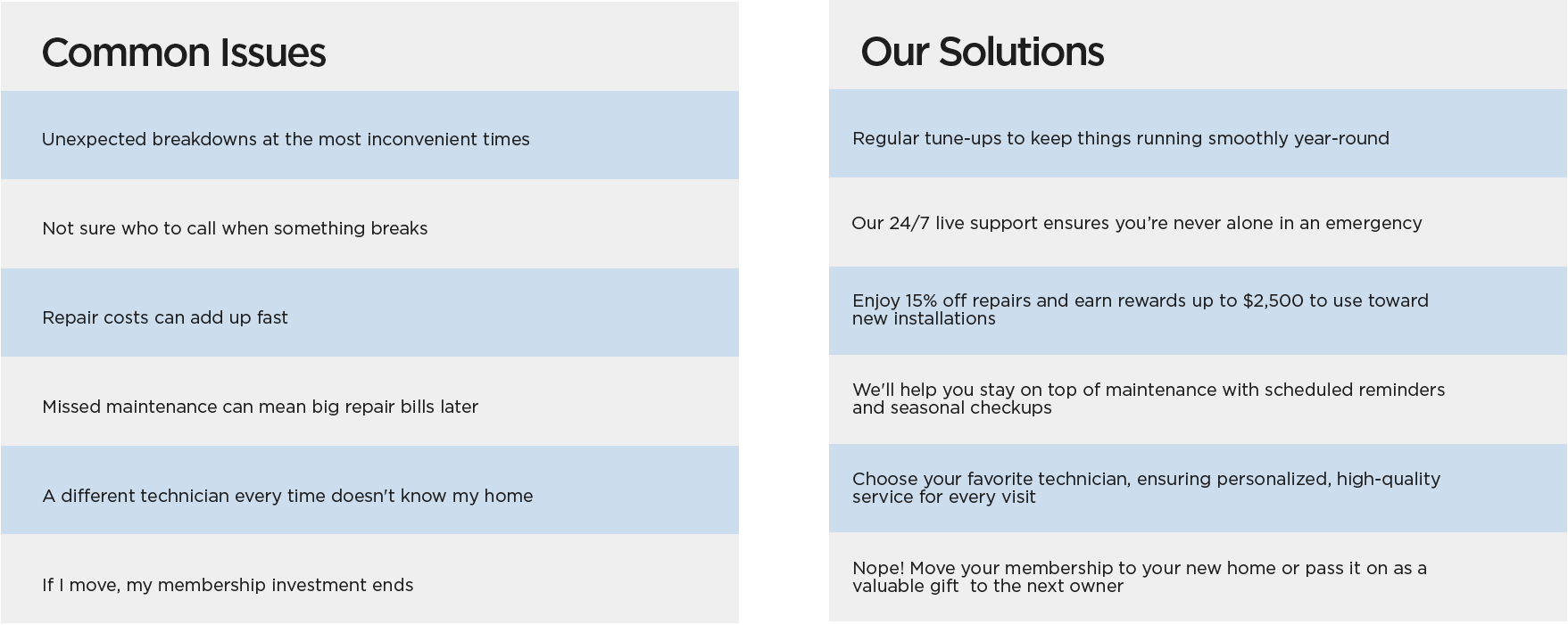 Unexpected breakdowns, rising costs, and the hassle of managing multiple service providers can leave you feeling overwhelmed. Comfort360 takes the stress out of home maintenance by providing comprehensive coverage for your HVAC and plumbing systems. With proactive maintenance, exclusive discounts, and 24/7 support, we help you stay ahead of costly repairs and ensure your home stays comfortable year-round. Say goodbye to surprises and hello to peace of mind with Comfort360.